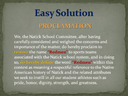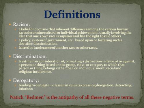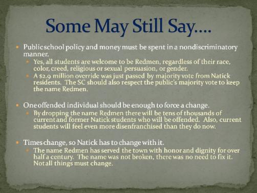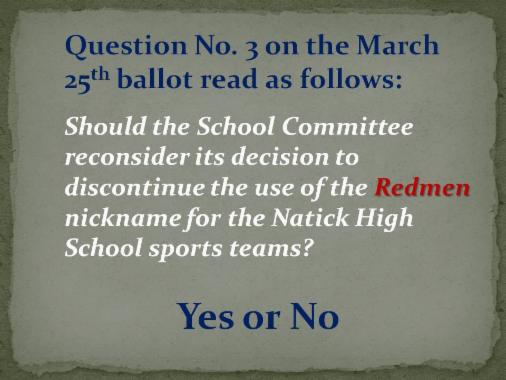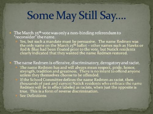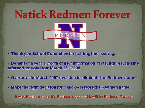 A list of those who spoke publicly against the Redmen is provided at the bottom of this page. These ANTI-REDMEN should be identified for the record, and should be shunned in Natick by those of us who know them for what they are - politically correct fascists.